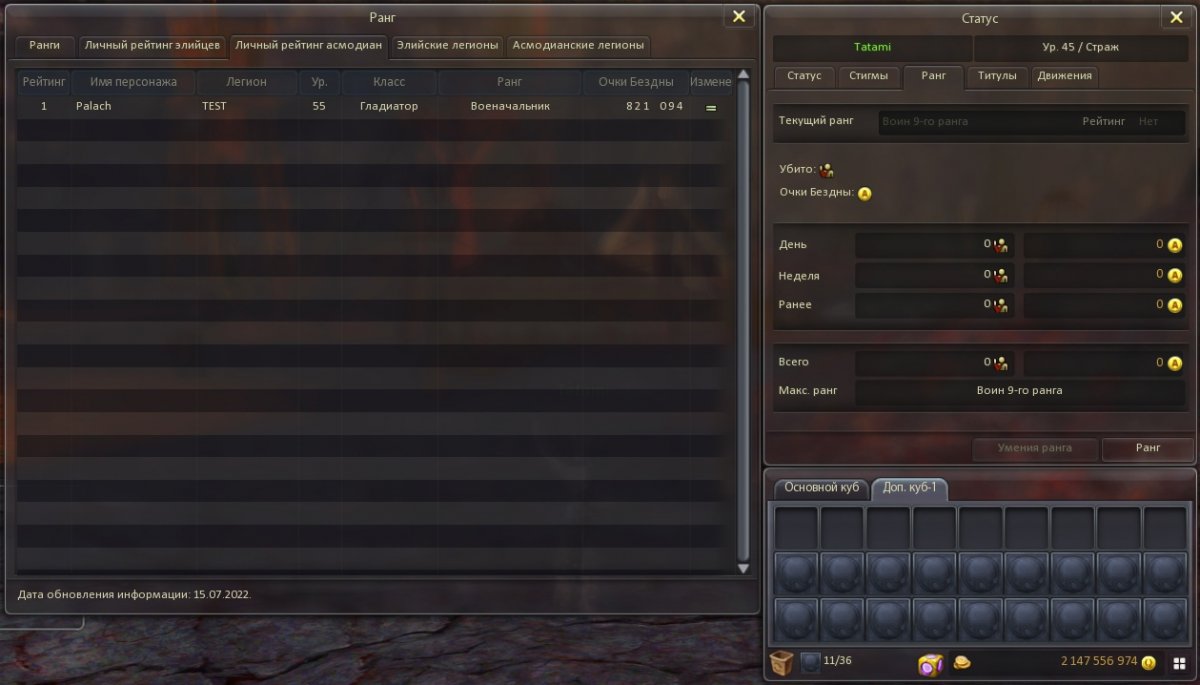 Дата проведения: 31 декабря 2021 года - 17 января 2022 года. Об ивенте: за выполнение квестов у Хармонана и Друйка вы можете получить ценные награды доступно для даэвов 50 уровня и выше Элийцы NPC Хармонан в Элизиуме [Ивент] Великая удача, врата судьбы! Необходимо добыть Осколок клинка света (добывается в Кельмаросе) х20 и Осколок клинка хаоса (добывается в тоннеле Силентера) х 10 штук. Асмодиане NPC Друйк в Пандемониуме [Ивент] Великая удача, врата предопределения! Необходимо добыть Осколок клинка тьмы (добывается в Ингисоне) х20 и Осколок клинка хаоса (добывается в тоннеле Силентера) х10. Монстры с которых добываются осколки: Тоннель Силентера (шанс выпадения осколков: 100%) Ядовитый шелук 55 Черный скорпион 55 Замшелый октасид 55 Калькельм защиты 55 Неистовая мантикора 55 Воин-нифилим 55 Ремесленник-нефилим 55 Длиннохвостый дранак 55 Элитный работник Силентеры 55 Ингисон (шанс выпадения осколков: 33%) Упрямый дракоби 55 Колючий дракоби 55 Серный циклоп 55 Серный рукх 55 Свирепый драйнас 55 Келькмарос (шанс выпадения осколков: 33%) Пустынный драйнас 54 Пустынный драйнас 55 Дракоби-наблюдатель 54 Дракоби-наблюдатель 55 Боевой дрейк 56-го легиона 55 Награда за квест - Золотой сундук балауров: Раздел 1 (рандомное выпадение 1 предмета 100%): Усилитель камней III (герой) х200 Маг. камень: HP +95 x2 Маг. камень: Точность +27 x2 Маг. камень: Сила магии +27 x2 Маг. камень: Блок щитом +27 x2 Маг. камень: Ф. крит. удар +17 x2 Маг. камень: Точность магии +14 x2 Маг. камень: Маг. защита +14 x2 Волшебный камень ур.75 х1 Усилитель камней III (герой) х400 Бесценная древняя чаша х1 Волшебный камень ур.80 х1 Золотая медаль х2 Волшебный камень ур.85 х1 Усилитель камней III (герой) х600 Платиновая медаль х1 Бесценная древняя корона х1 Волшебный камень ур.90 х1 Волшебный камень ур.95 х1 Раздел 2 (рандомное выпадение 1 предмета 5%): Меч Тахабаты Боевой молот Тахабаты Кинжал Тахабаты Орб Тахабаты Гримуар Тахабаты Двуручный меч Тахабаты Копье Тахабаты Посох Тахабаты Длинный лук Тахабаты Щит Тахабаты