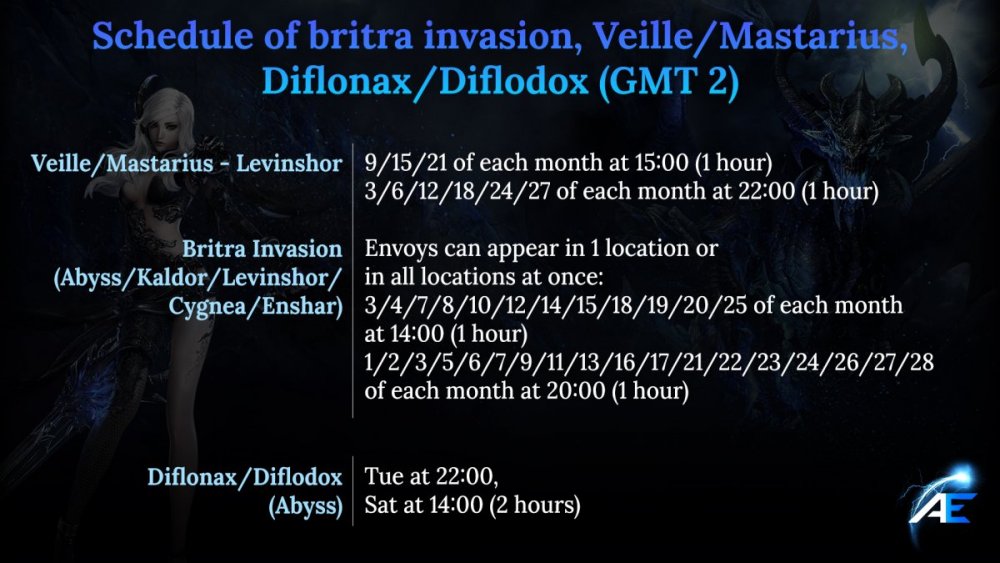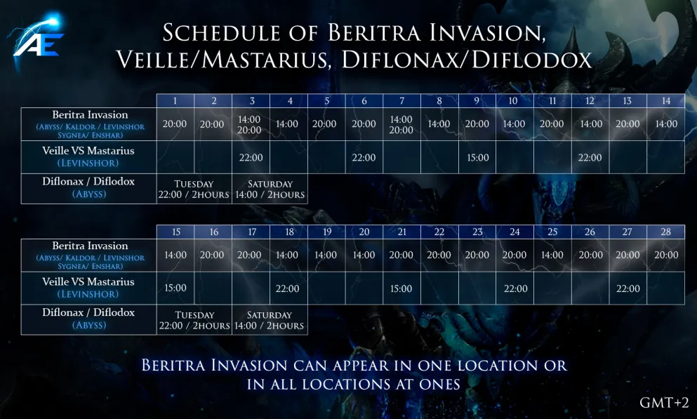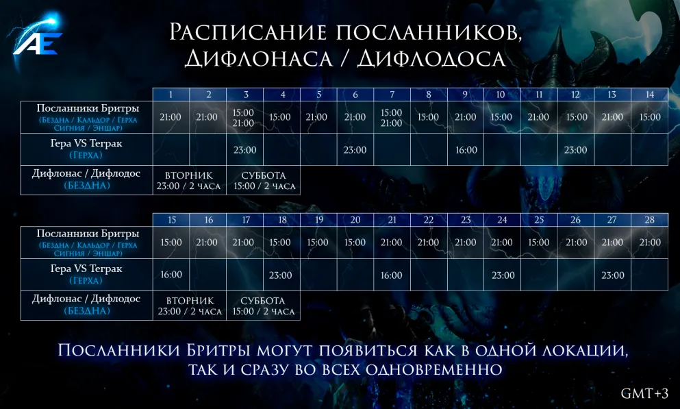 Изменения после рестарта 29.10.2024. 1. Поправлен выход из разлома Сигния=>Эншар. 2. Посланники бритры/Дифлы/ГераvsТеграк - часть перенесена на другое время: Посланники рандомно могут появится в одной из следующих локаций: Сигния, Эншар, Кальдор, Герха, Бездна. Посланники могут появится как в 1 локации, так и сразу во всех. 3,4,7,8,10,12,14,15, 18, 19, 20, 25 время появления 17.00 (GMT 3) (сделано для дальневосточных регионов и Китая) 1,2,3,5,6,7,9,11,13,,16,17,21,22,23,24,26,27,28 время появления 20.00 (GMT 3) Гера/Теграк 9/15/21 время появления 18.00 (GMT 3) 3/6/12/18/24/27 время появления 23.00 (GMT 3) Дифлонас/Дифлодос вт - 23:00 (GMT 3), сб - 15:00 (GMT 3) Changes after restart on 29.10.2024. 1. Corrected the exit from the rift Cygnea=>Enshar. 2. Britra invasion/Diflonax/Diflodox/VeilleVsMastarius - some of the activities have been rescheduled: Envoys can randomly appear in one of the following locations: Cygnea, Enshar, Kaldor, Levinshor, Abyss. Envoys can appear in 1 location or in all locations at once. 3,4,7,8,10,12,14,15, 18, 19, 20, 25 appearance time 16.00 (GMT 2) (made for Far East regions and China). 1,2,3,5,6,7,9,11,13,16,17,21,21,22,22,23,24,26,27,28 appearance time 19.00 (GMT 2) VeilleVsMastarius 9/15/21 appearance time 17.00 (GMT 2) 3/6/12/18/24/27 appearance time 22.00 (GMT 2) Diflonax/Diflodox Tue - 22:00 (GMT 2), Sat - 14:00 (GMT 2)
