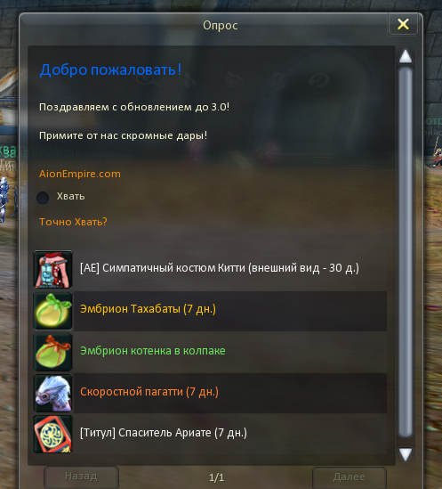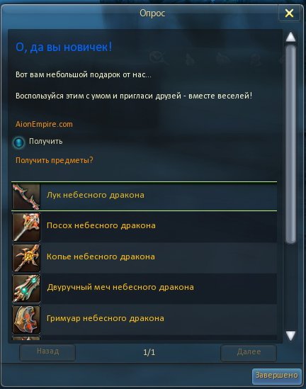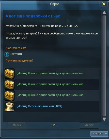 Время проведения: на постоянной основе. Дорогие игроки и новички нашего сервера! Мы для вас подготовили акцию, благодаря которой старт для новых персонажей будет комфортным. Игрокам с 10 до 49 уровня будет доступен опрос с предметами для более легкого старта на сервере. Можно забрать 1 предмет на одного персонажа на игровом аккаунте, для это выберите получить -> выберите желаемое оружие -> нажмите завершено. Лук небесного дракона Посох небесного дракона Копье небесного дракона Двуручный меч небесного дракона Гримуар небесного дракона Орб небесного дракона Кинжал небесного дракона Булава небесного дракона Меч небесного дракона БУДЬТЕ ВНИМАТЕЛЬНЫ ПРИ ВЫБОРЕ ОРУЖИЯ, ОБМЕНЯТЬ ЕГО НЕЛЬЗЯ!!! В ТОМ ЧИСЛЕ ЧЕРЕЗ АДМИНИСТРАЦИЮ И ТЕХ.ПОДДЕРЖКУ! Также для персонажей с 11 по 49 уровень будет доступен опрос с расходными материалами для упрощенного старта на сервере: [Ивент] Освежающий чай (10%) х30 [Нельзя обменять]; [Нельзя продать на аукционе] [Ивент] Ящик с припасами для даэва-новичка х3 [Нельзя обменять]; [Нельзя продать на аукционе] Порядок получения такой-же: выберите получить -> нажмите завершено. Содержимое [Ивент] Ящик с припасами для даэва-новичка: Редкое зелье восстановления IV х50 Редкое зелье жизни IV х50 Редкое зелье маны IV х50 Редкое зелье ветра III х50 Сильное зелье исцеления х50 Свиток ускорения III х50 Свиток перерождения III/Свиток отваги III х50 Свиток поглощения урона III х50 И опрос с подарками будет доступен для персонажей с 20 по 50 уровень: [AE] Симпатичный костюм Китти (30дн.) Эмбрион Тахабаты (7дн.) Эмбрион котенка в колпаке Скоростной пагатти (7дн.) [Титул] Спаситель Ариате (7дн.) Удачи каждому даэву в покорении вершин!