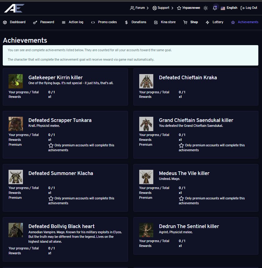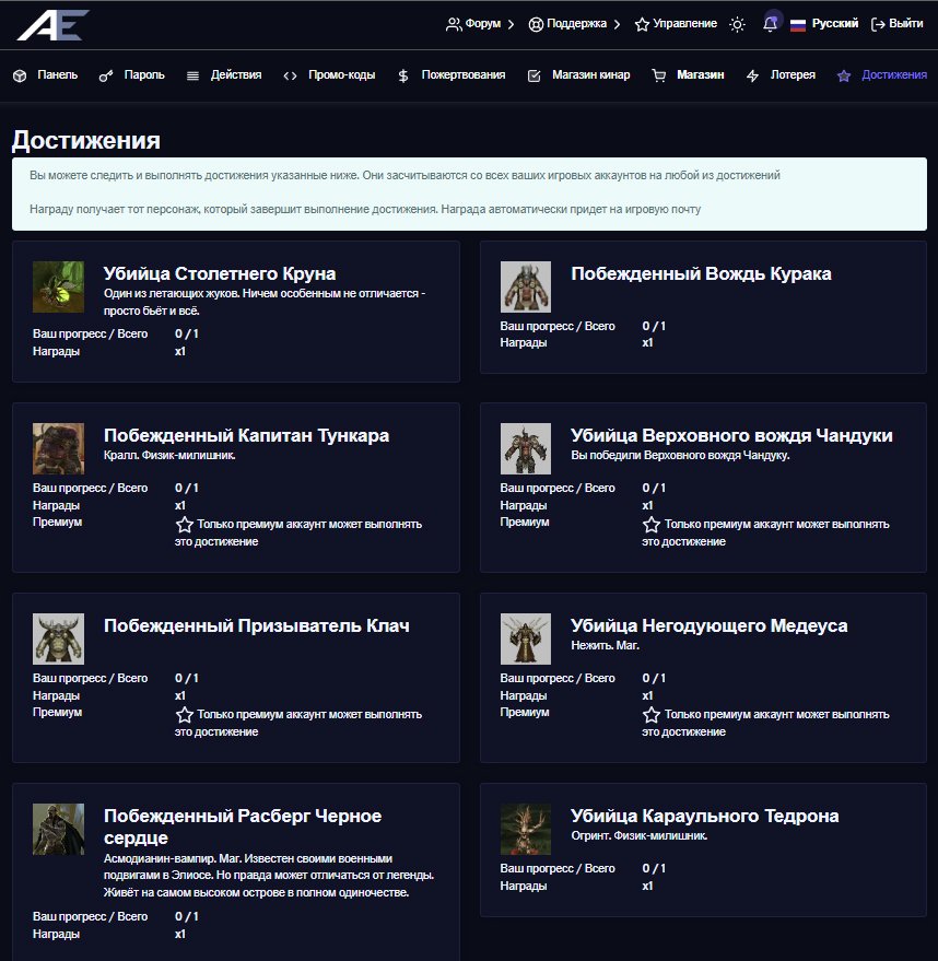 Imperfection 163 Опубликовано 1 сентября, 2022 RUSSIAN Скрыть контент ✨Дорогие друзья!✨ Мы хотим объявить радостную новость - на нашем сервере доступна система достижений (ачивок). Что она из себя представляет? На нашем сайте есть вкладка "Достижения", в которой представлены задания, где вы должны убить именных монстров. Как получить награду за выполнение заданий? Награду получает тот персонаж, который завершит выполнение достижения. Награда автоматически придет на игровую почту. Что мне нужно знать о системе? Задания засчитываются со всех ваших игровых аккаунтов на любой из достижений, т.е. вы можете выполнять задания всеми персонажами, но награду получит тот, на котором вы выполнили задание. Чтобы ачивка засчиталась нужно чтобы был получен опыт персонажем. Так же есть достижения, которые доступны только игрокам с премиумом. Можно ли повторно выполнять задания? Некоторые задания можно повторять через определенный промежуток времени после его завершения (7, 14 дней). Какие награды меня ждут за выполненные достижения? Скрыть контент [Ивент] Подарок удачи: (Один из этих предметов выпадает рандомно. Шанс на выпадение любого предмета - одинаковый.) Надежный свиток ускорения х5 Надежный свиток отваги х5 Надежный свиток перерождения х5 Зелье исцеления х20 Зелье восстановления V х20 Надежный свиток яростного ветра х5 Надежный свиток м. крита х5 Надежный свиток ф. крита х5 Список достижений с данной наградой: Убийца Столетнего Круна Побежденный Вождь Курака Побежденный Капитан Тункара Убийца Верховного вождя Чандуки Побежденный Призыватель Клач Убийца Негодующего Медеуса Побежденный Расберг Черное сердце Убийца Караульного Тедрона Свергнутая Королева Синорел Убийца Жреца Нашума Побежденный Старейшина Нарикики Убийца Жестокого Таха Победитель Проклятого Кверна Свергнутая Кровожадная Джахамма Убийца Быстрой Кануки Победитель Вождя Ниуки Побежденный вождь Касака Ураган Свергнутый Король Зукок Свергнутая Королева Аллукина Убийца Духа-хранителя Фенэйо Победитель Легендарного Масту Побежденный Фермер Хабеньяк Убийца Зловредного Турату Побежденный Старейшина Стис Убийца Гордого Тхини Побежденный Капитан налетчиков Раху Убийца Изгнанного воина Невета Свергнутая Королева Ютинель Победитель фанатика Андуха Тот, кто уничтожил Циклопа Менотиоса Убийца Пламенного гратера [Ивент] Благословенный подарок: (Один из этих предметов выпадает рандомно. Шанс на выпадение любого предмета - одинаковый.) Волшебный камень 90ур. х1 Золотая медаль х1 Дорогая древняя корона х1 Обычная древняя корона х1 Дорогая древняя чаша х1 Простая древняя корона х2 Бесценная древняя чаша х1 Бесценная древняя корона х1 Платиновая медаль х1 Список достижений с данной наградой: Тот, кто уничтожил Хранителя Валона Тот, кто уничтожил Мутанта Натараза Великий защитник (Элиос) Великий защитник (Асмодея) Серебряная медаль х1 и Дорогая древняя чаша х1: Храбрый рыцарь (Элиос) Храбрый рыцарь (Асмодея) Золотая медаль х1 и Дорогая древняя чаша х1: Бесстрашный воин (Элиос) Бесстрашный воин (Асмодея) Платиновая медаль х1: Безжалостный убийца (Тоннель Силентера) ENGLISH Скрыть контент ✨Dear friends!✨ We have great news for you! On our server a system of achievements is available! What is it? Our website has an "Achievements" tab, which presents tasks where you must kill named monsters. How do I get a reward for completing an achievement? The character that will complete the achievement goal will receive reward via game mail automatically. What do I need to know about t